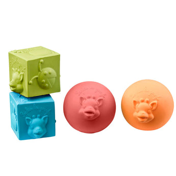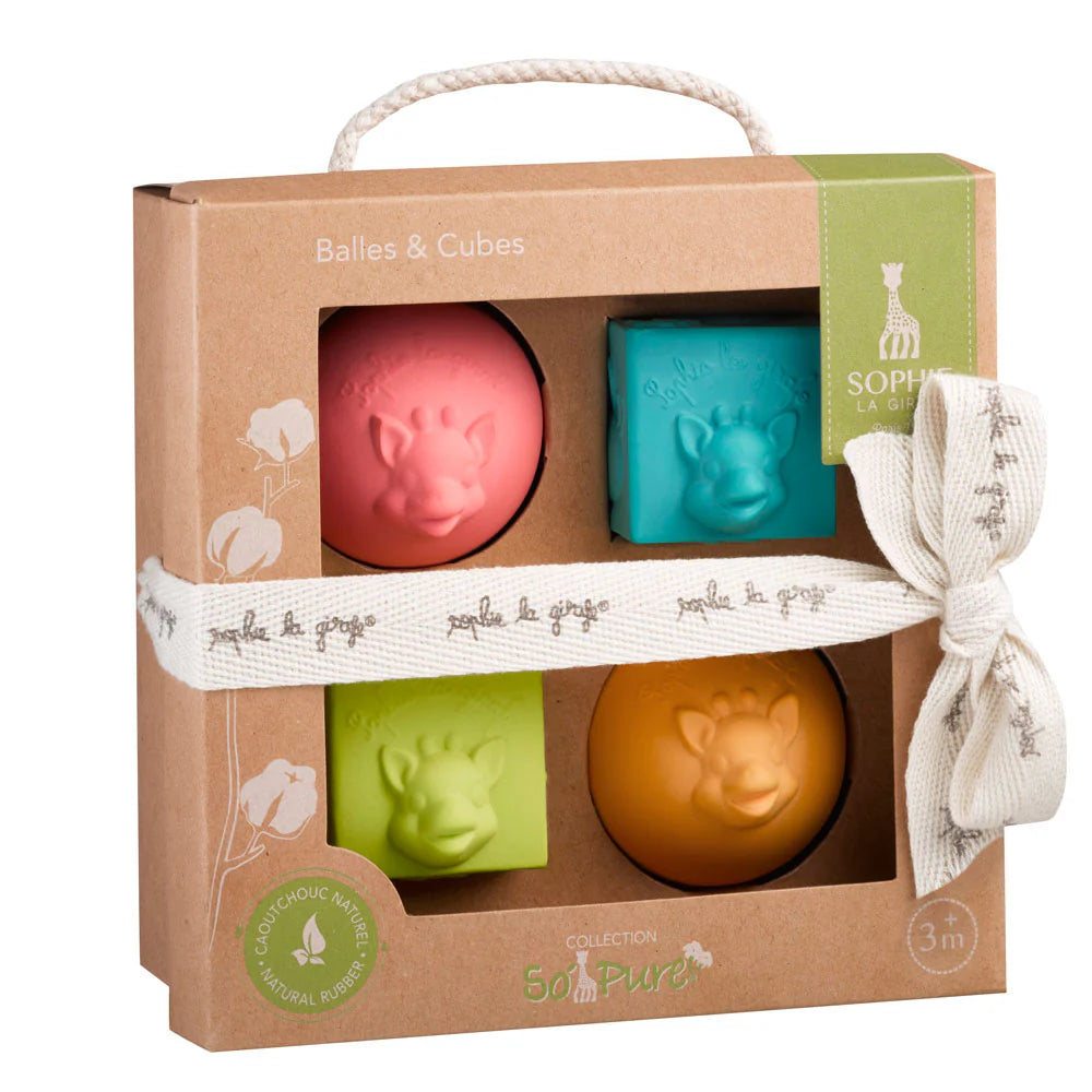 Seti So'Pure Cubes & Balls nga Sophie la Girafe përfshin kuba dhe topa të butë për të stimuluar shqisat dhe për të ndihmuar në zhvillimin motorik të foshnjave. Të bëra nga goma natyrale, ato janë të sigurta për kapje, kafshim dhe lojë, duke ofruar një përvojë të qetë për dhëmbëzimin e fëmijëve.
