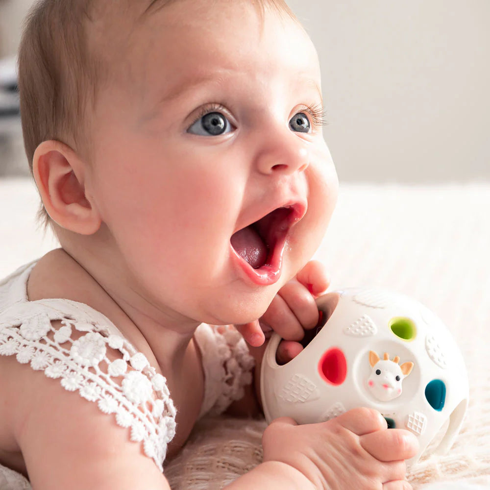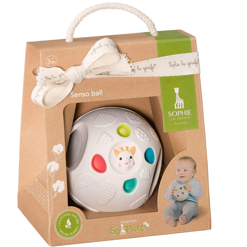 Topi So'Pure Senso nga Sophie la Girafe është krijuar për të ndihmuar zhvillimin e aftësive motorike të foshnjës. I bërë nga goma natyrale, ai përmban tekstura të ndryshme për stimulimin shqisor, dhe është i lehtë për t’u kapur dhe kafshuar, duke qetësuar mishrat gjatë dhëmbëzimit.