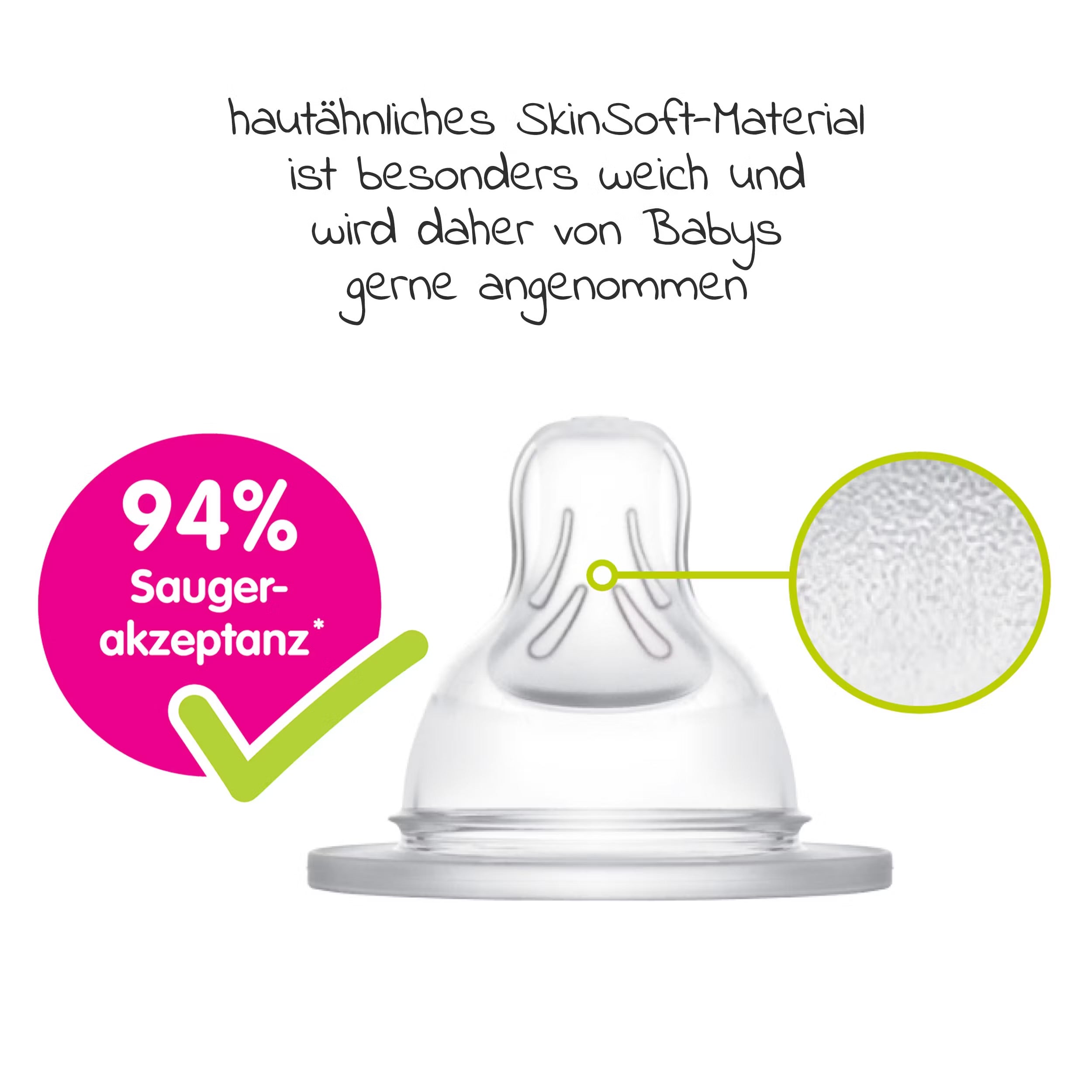 Forma simetrike e bën që të përshtatet në mënyrë perfekte në gojën e foshnjës në çdo pozicion, ndërsa rrjedhja e kontrolluar është e përshtatshme për ushqime të lehta (1s food), çaj dhe ujë.