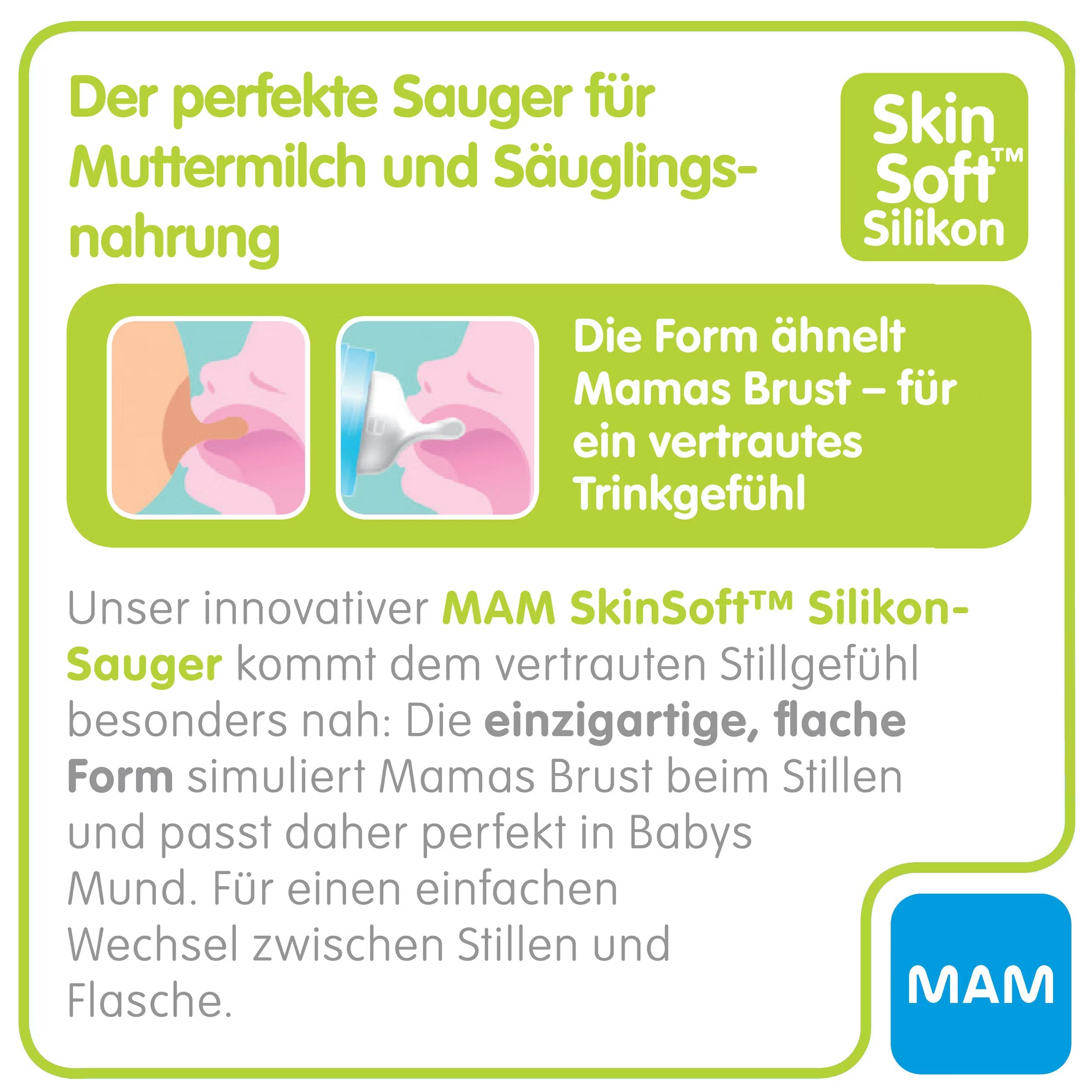 Biberoni i silikonit MAM Silicone Teat është zgjidhja ideale për një kalim të lehtë dhe të natyrshëm nga gjiri në shishe pas muajit të katërt të foshnjës. Me sipërfaqen e butë SkinSoft™, që i ngjan ndjesisë së lëkurës, ky biberon pranohet nga shumica e foshnjave me lehtësi (94% e foshnjave e kanë pranuar në testime).
