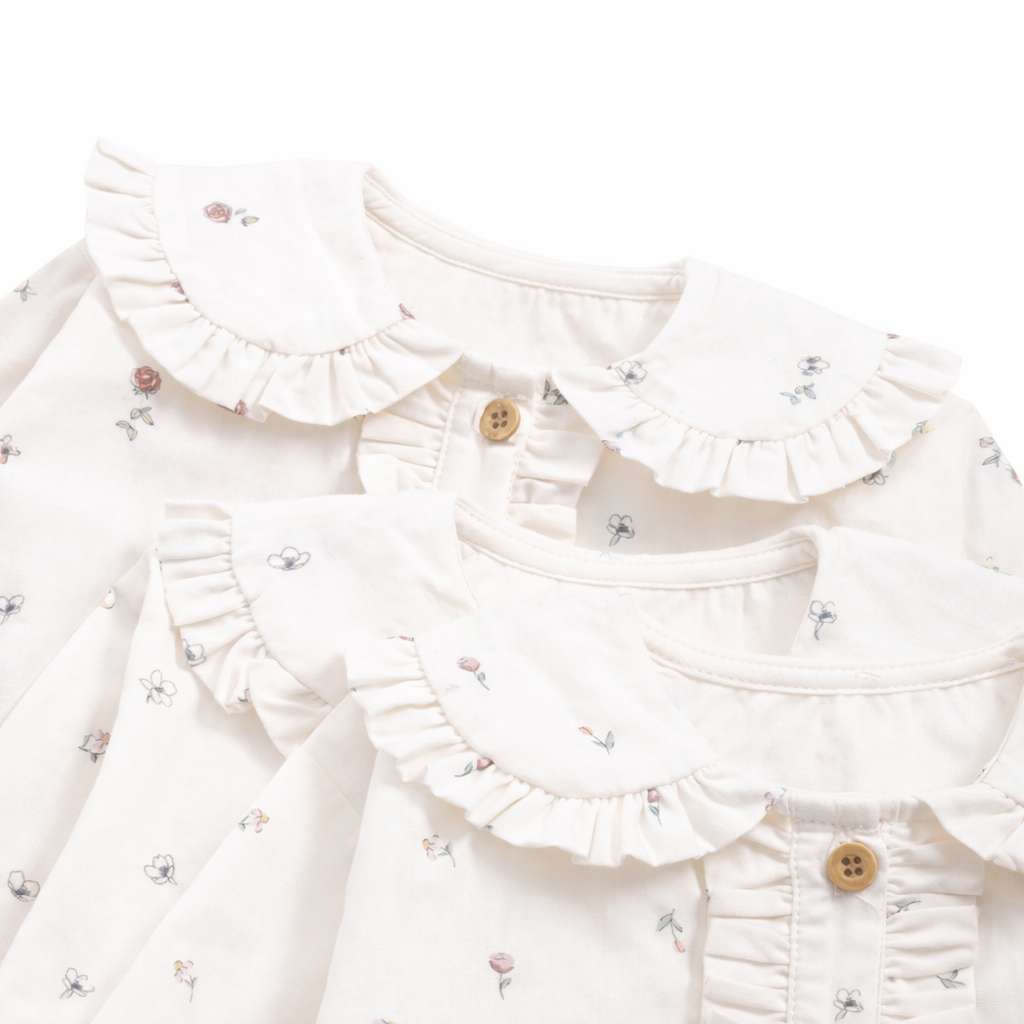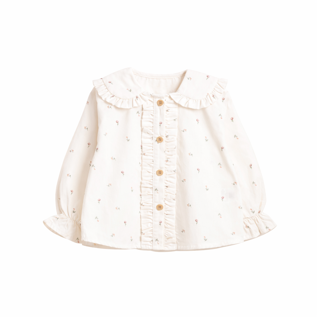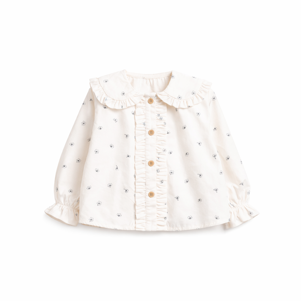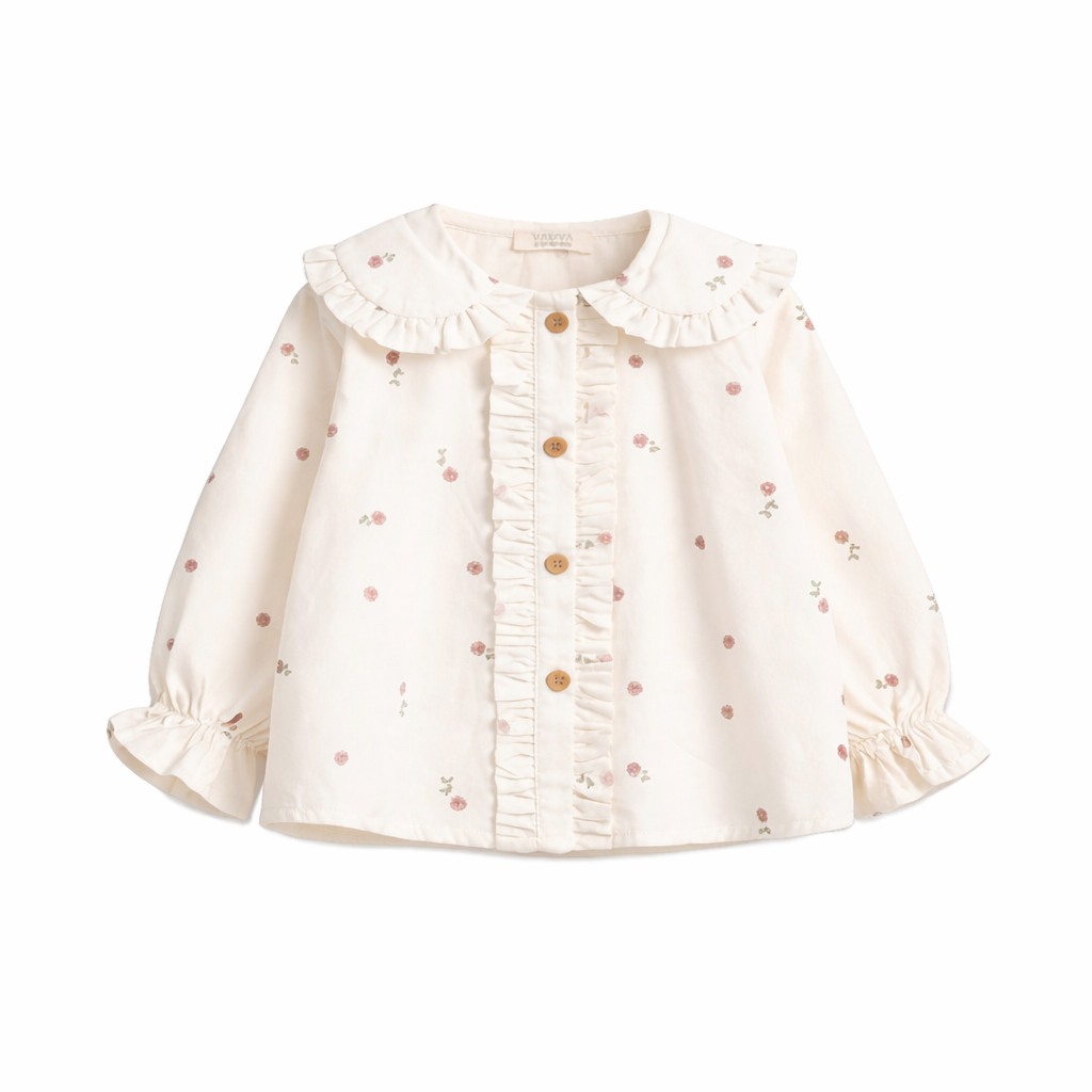 Këmishë për vajza me dizajn delikat dhe elegant, ideale për përdorim të përditshëm ose raste të veçanta. E punuar nga material i butë dhe i rehatshëm për lëkurën e fëmijës, kjo këmishë vjen në ngjyrë të çelët me print të imët që i jep një pamje të ëmbël dhe klasike. Jakë e rrumbullakët me detaje frill, mbyllje me pulla përpara dhe mëngë të gjata me fund të lehtë të rrudhur, që ofrojnë rehati dhe stil në të njëjtën kohë. Kombinohet lehtësisht me pantallona, funde apo komplete të ndryshme, duke e bërë një zgjedhje shumë praktike për garderobën e vajzave.