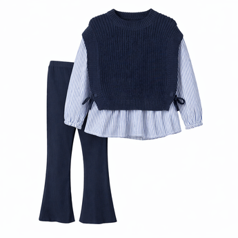 Ky komplet për vajza përbëhet nga një xhemper i thurur i kombinuar me këmishë të integruar, ku duken vetëm mëngët dhe fundi i këmishës, së bashku me pantallona me prerje moderne dhe fund të lehtë flare. Dizajni i shtresuar i jep setit një pamje shumë të veçantë dhe trendi.