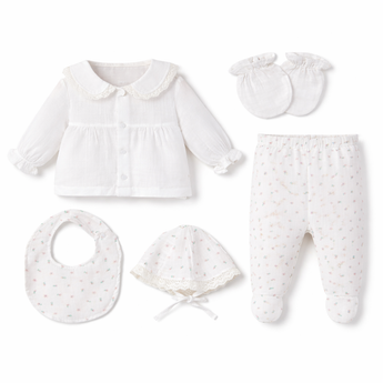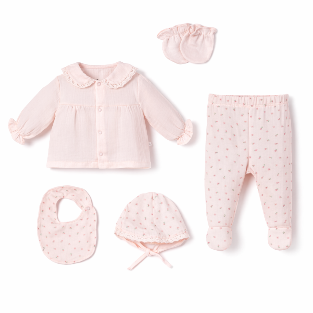 Përmbajtja e setit: Ky set përfshin një bluzë me kopsa që vishet lehtë, pantolla me këmbëza që mbajnë beben ngrohtë dhe rehat, një kapelë të butë për mbrojtje shtesë, dorëza që ndihmojnë në parandalimin e gërvishtjeve si dhe një grykëse praktike për përdorim gjatë ushqimit apo përditshmërisë.