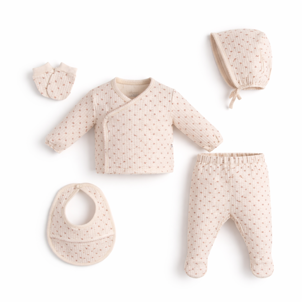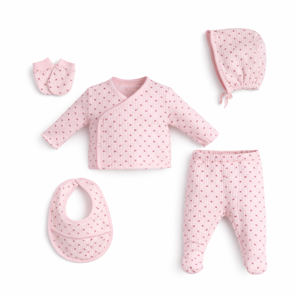 Seti përfshin një bluzë me hapje anësore që e bën veshjen më të lehtë, pantolla me dizajn praktik për lëvizje të lirë, kapelë për të mbajtur beben ngrohtë, dorëza për mbrojtje nga gërvishtjet dhe një përparse të butë që ndihmon në mbajtjen e rrobave të pastra.