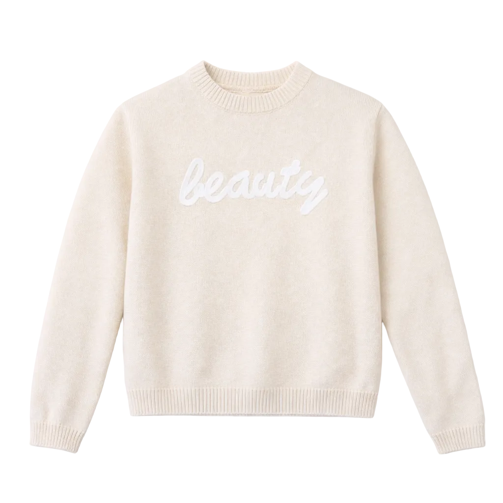 Dizajni minimalist me jakë të rrumbullakët dhe mëngë të gjata i jep veshjes një stil të thjeshtë dhe modern. Mbishkrimi dekorativ “beauty” në pjesën e përparme shton një prekje elegante dhe delikate, duke e bërë xhemperin të lehtë për t’u kombinuar me pantallona, xhinse apo funde për përdorim të përditshëm.