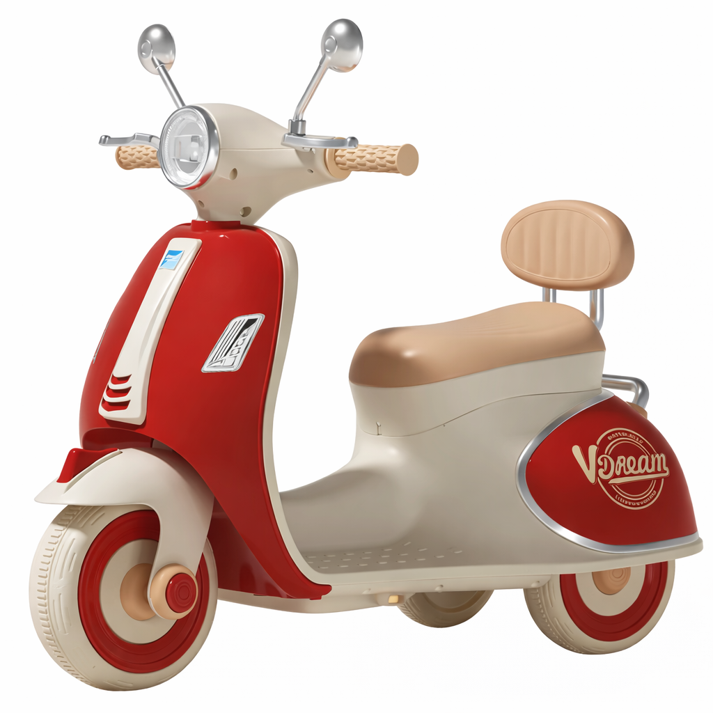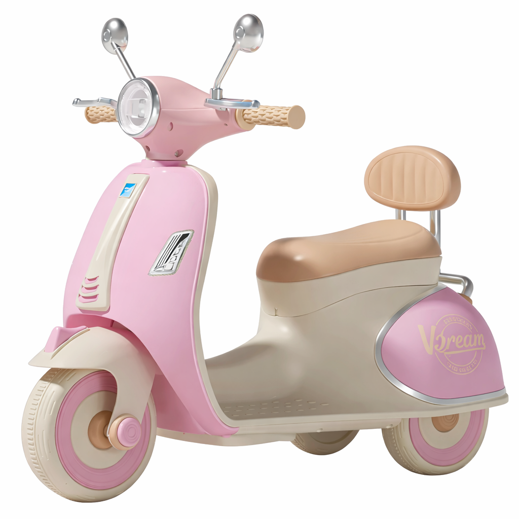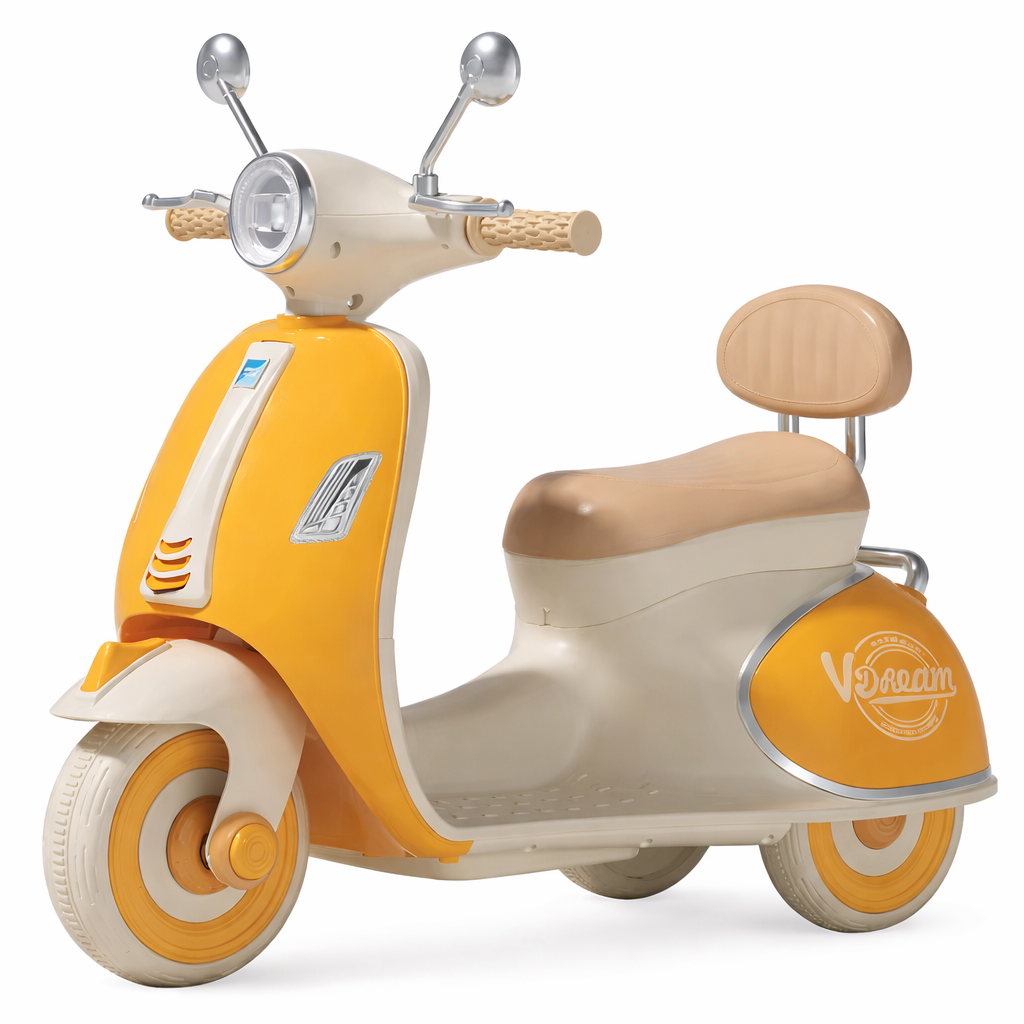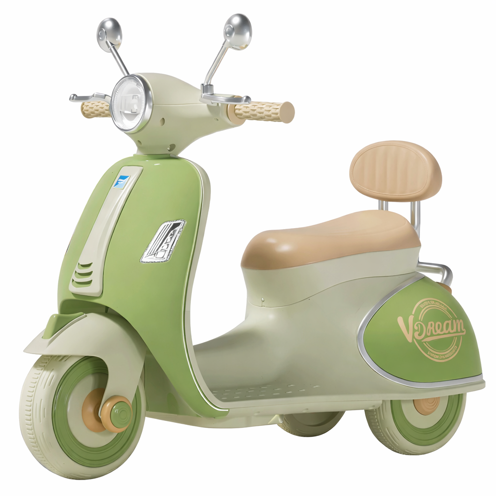 Motorr elektrik për fëmijë me dizajn klasik vintage dhe detaje elegante kromi, i krijuar për të sjellë stil dhe argëtim në çdo aventurë. Me formë ikonike skuter dhe kombinim ngjyrash të buta moderne, ky model është perfekt për fëmijët që duan të vozisin me stil.