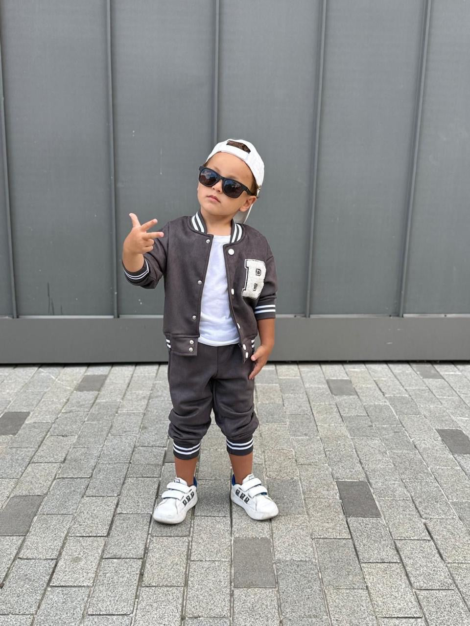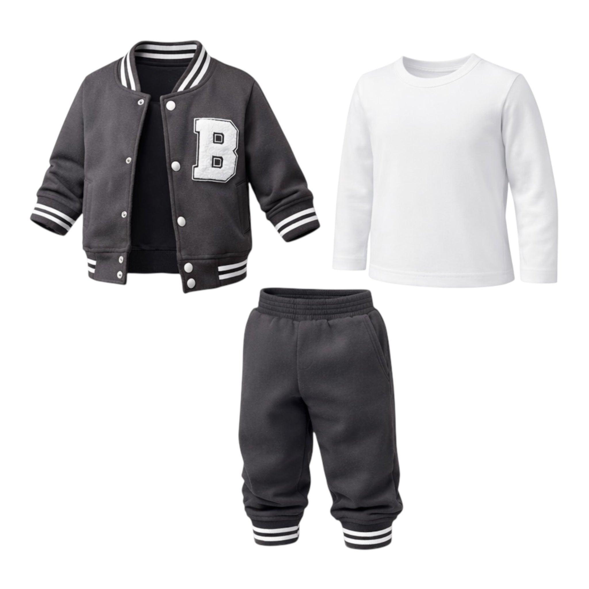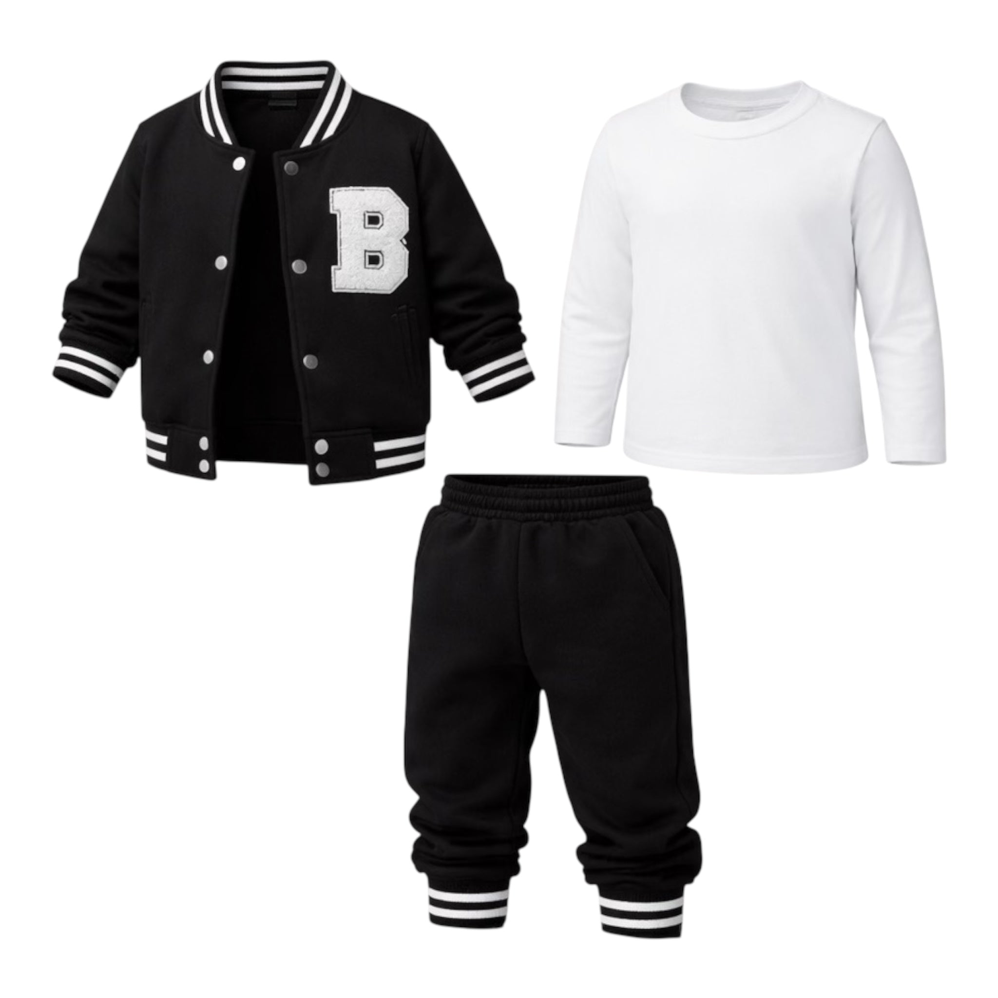 Komplet modern për djem, i përbërë nga tri pjesë: xhaketë sportive, bluzë me mëngë të gjata dhe pantallona, i dizajnuar për rehati dhe stil në përditshmëri. Materiali i butë dhe cilësor siguron ndjesi të këndshme gjatë veshjes, ndërsa prerja praktike lejon lëvizje të lirë gjatë lojës apo aktiviteteve ditore. Pantallonat me bel elastik përshtaten lehtë, ndërsa dizajni sportiv e bën këtë komplet ideal për shkollë, shëtitje dhe dalje casual.
