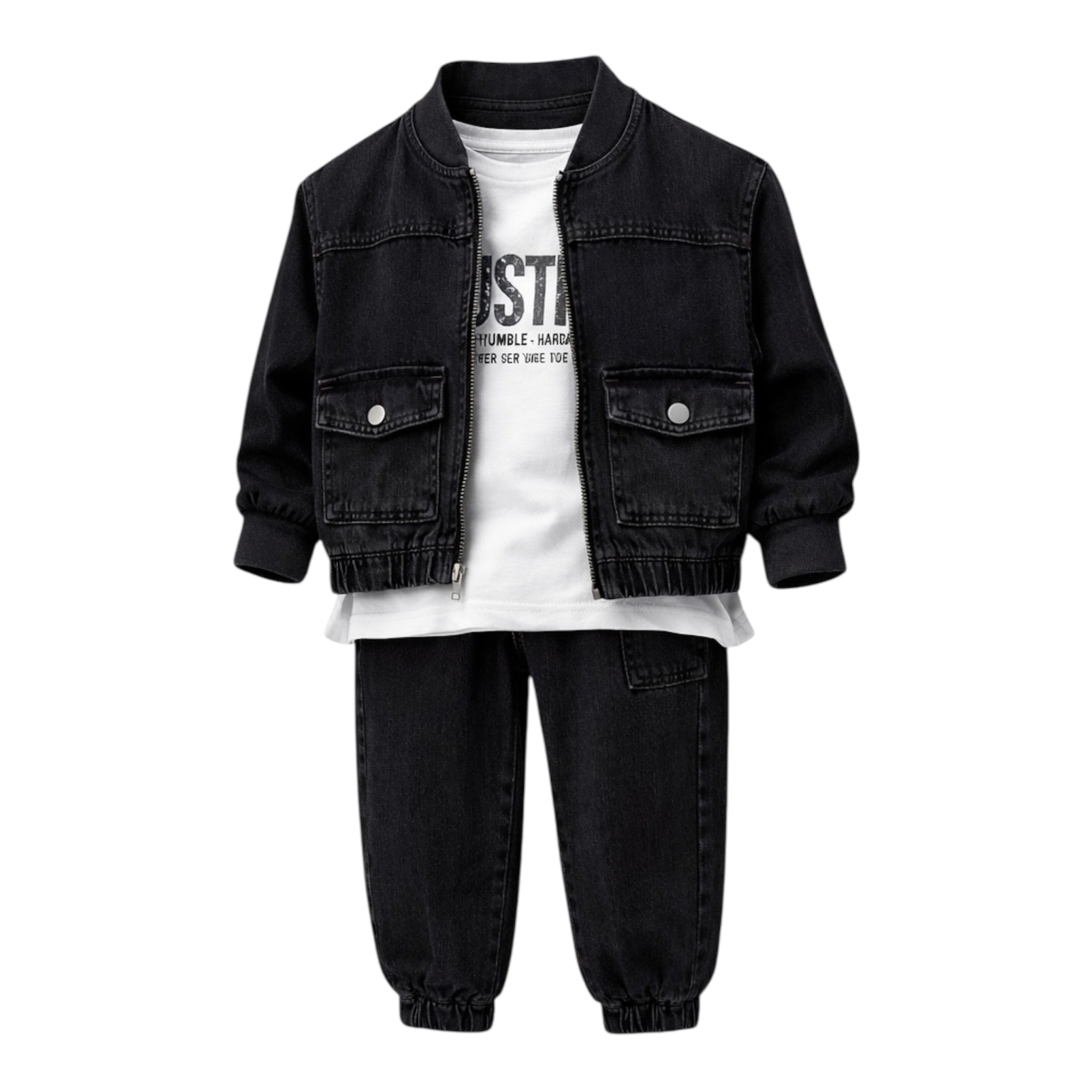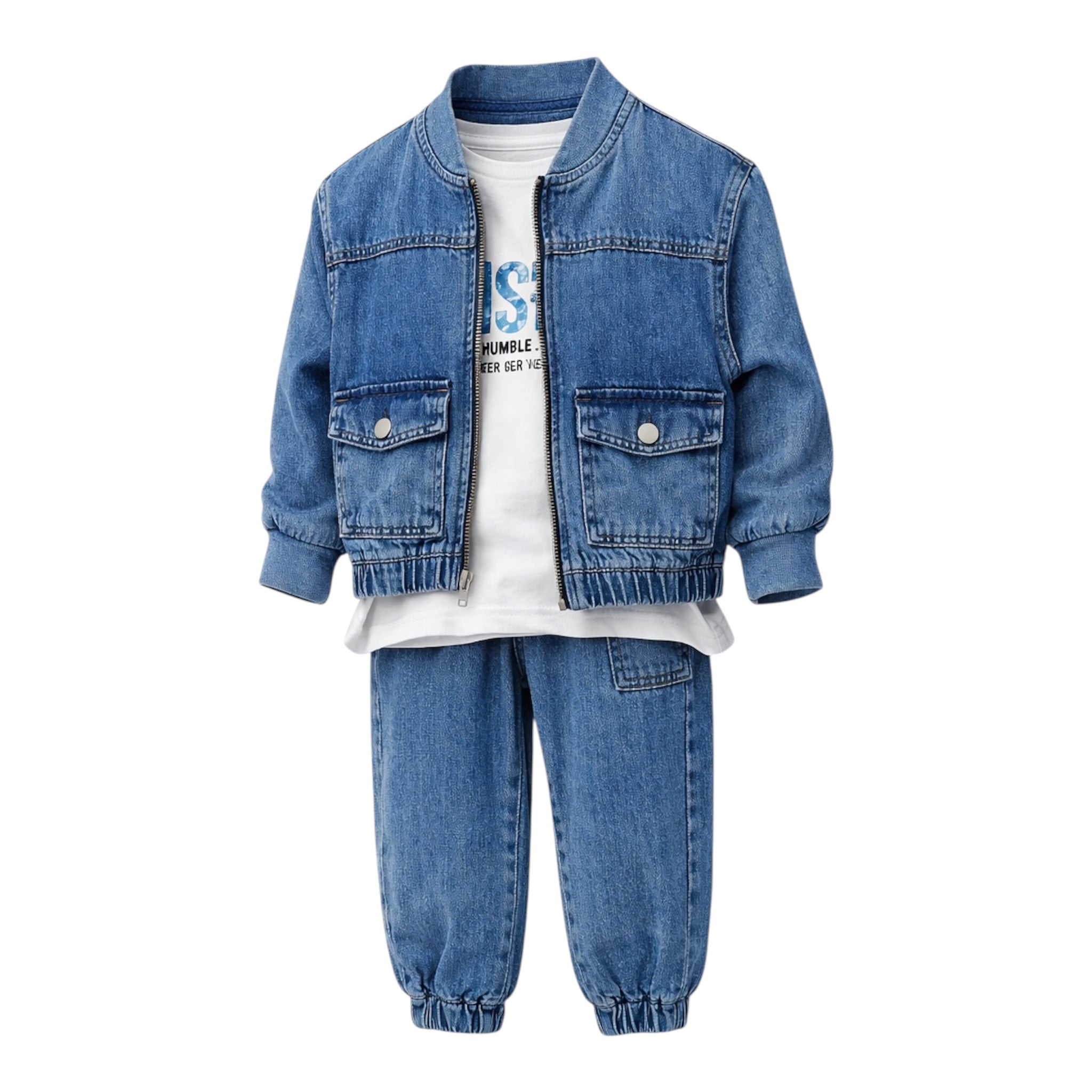 I punuar nga material farmerk cilësor, seti ofron qëndrueshmëri, rehati dhe lëvizje të lirë për fëmijën gjatë gjithë ditës. Dizajni sport–casual e bën të përshtatshëm si për veshje të përditshme, ashtu edhe për dalje apo raste të veçanta.