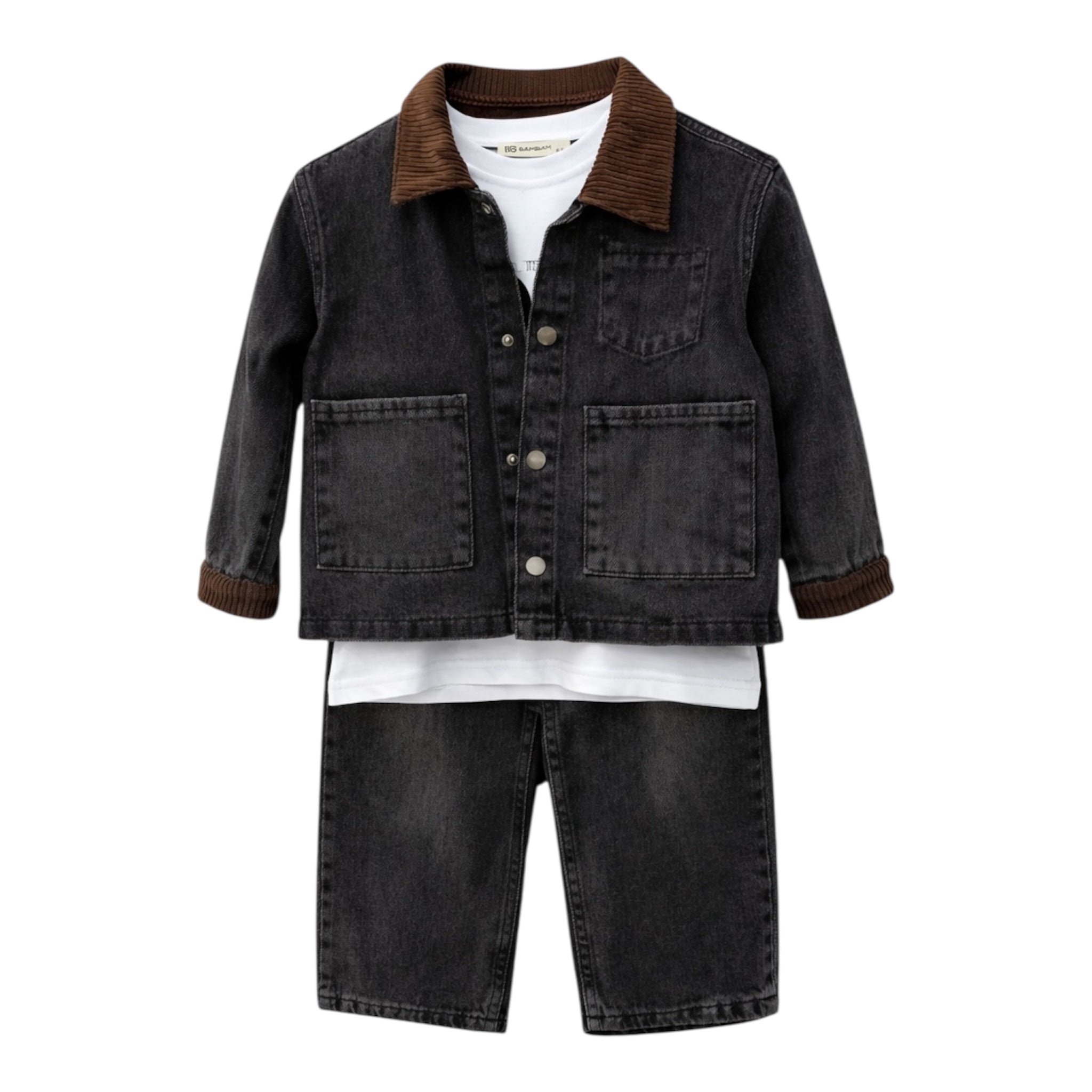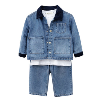 Ky set elegant është dizajnuar për të kombinuar stilin dhe rehatinë në veshjen e përditshme të fëmijëve. I punuar nga material farmerkë cilësore, seti ofron qëndrueshmëri, komoditet dhe një pamje moderne.