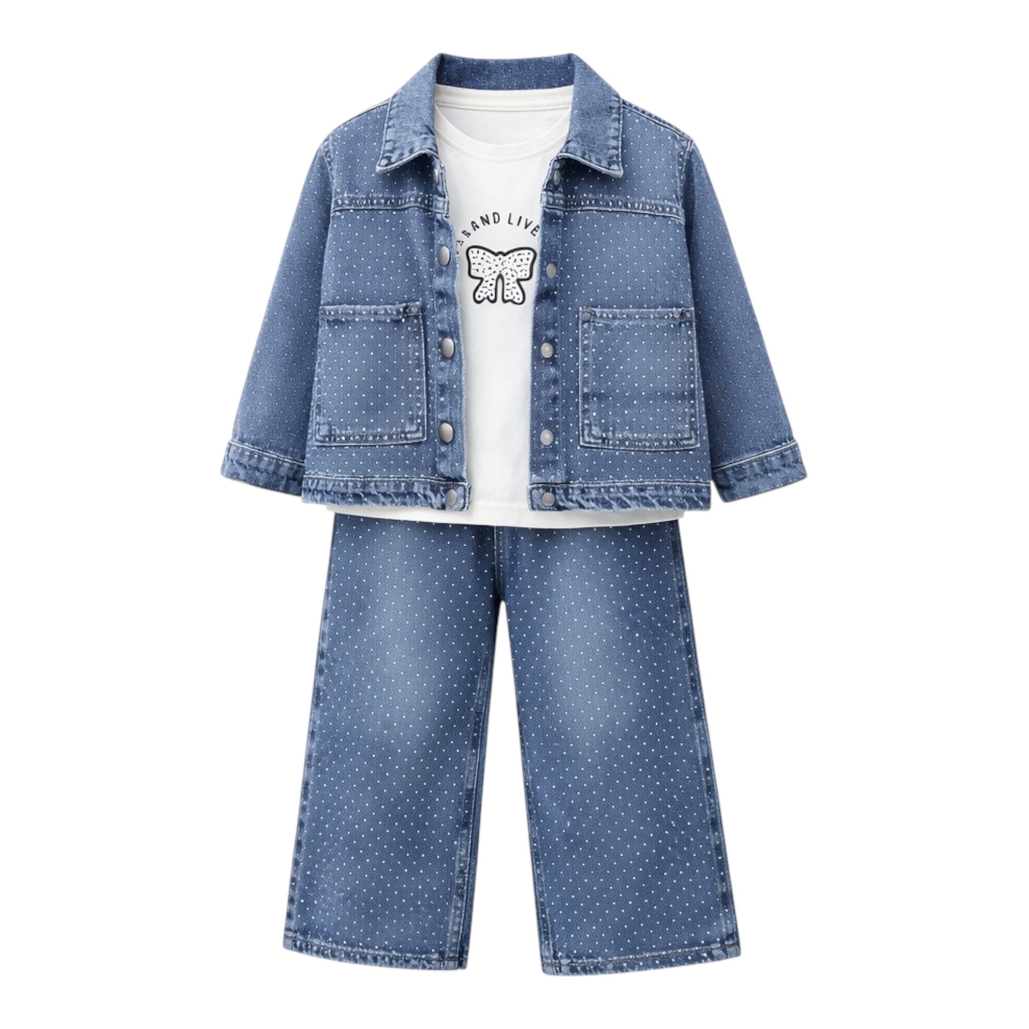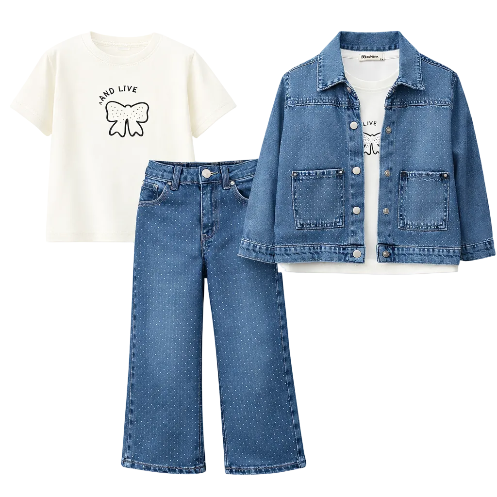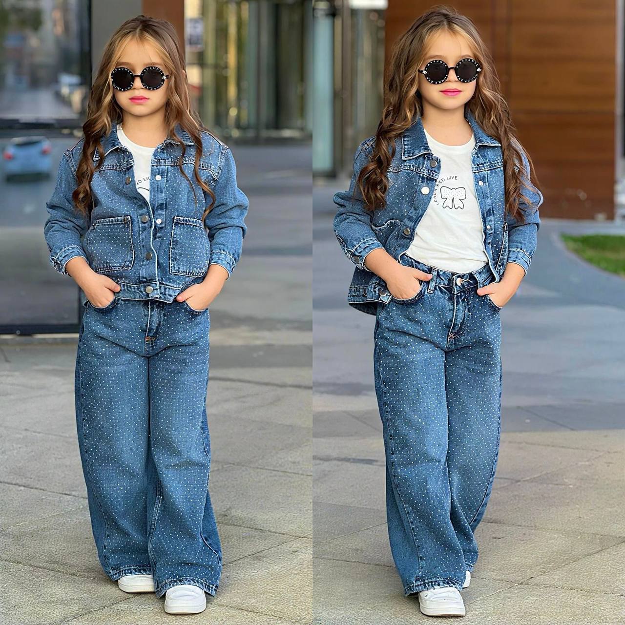 Pantallonat dhe xhaketa farmerke vijnë me dizajn të butë dhe komod, të përshtatshme për lëvizje të lirë, ndërsa bluza e brendshme e bardhë e plotëson setin me një stil të pastër dhe të freskët. Materialet janë të rehatshme për përdorim ditor, ideale si për dalje, ashtu edhe për veshje casual.