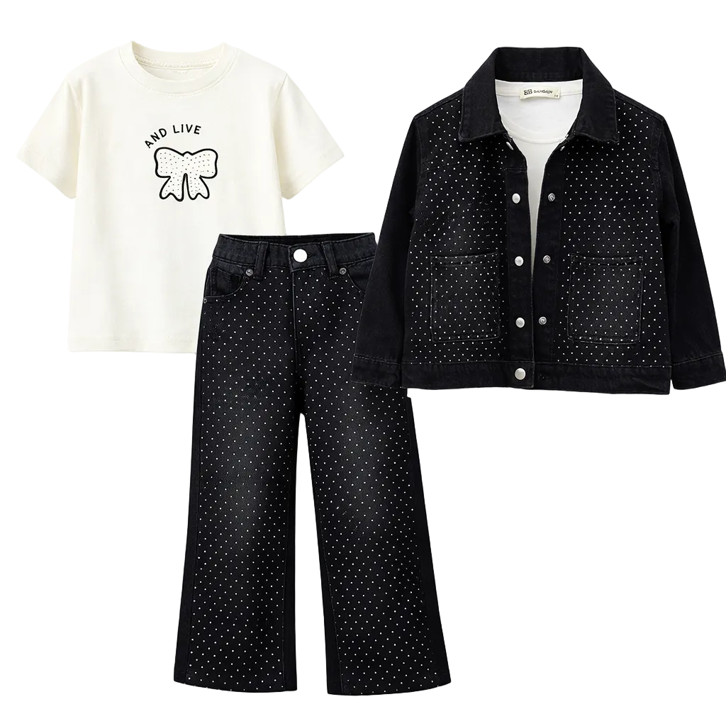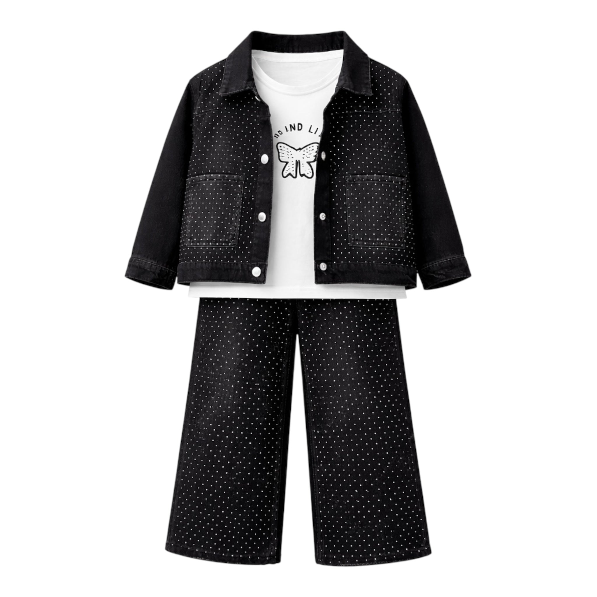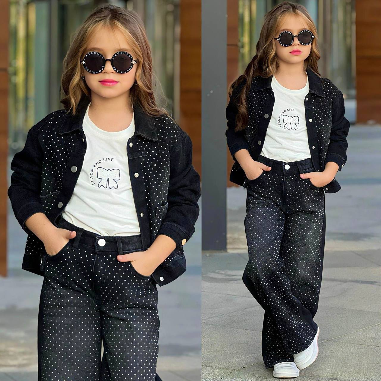 Ky komplet për fëmijë me 3 pjesë është zgjedhja perfekte për një stil modern dhe praktik në përditshmëri. Seti përfshin pantallona farmerke, bluzë të bardhë dhe xhaketë farmerke, të dizajnuara për t’u kombinuar lehtë dhe për t’i dhënë fëmijës një pamje të kuruar dhe trendi.