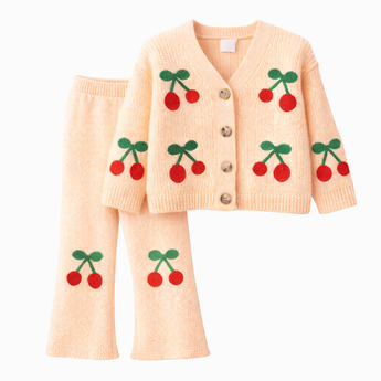Ky komplet i veçantë për vajza përbëhet nga një triko e thurur me mbyllje me kopsa, e zbukuruar me detaje dekorative në formë frutash, e kombinuar me pantallona të gjata me prerje të lehtë flare. Dizajni lojcak dhe i kuruar e bën këtë set ideal për veshje të përditshme apo dalje të veçanta.