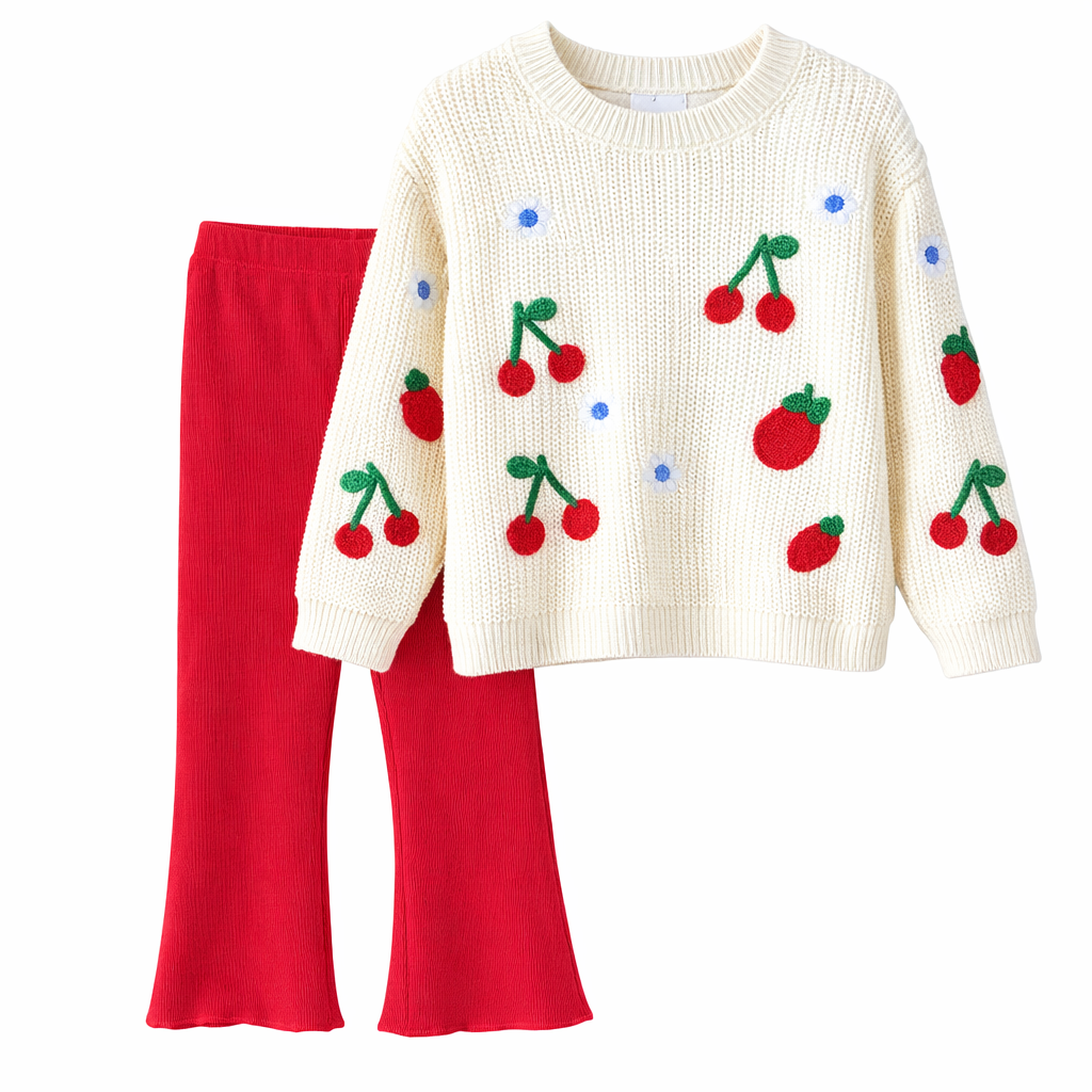 Ky komplet i bukur për fëmijë përbëhet nga një triko e thurur me mëngë të gjata dhe pantallona të rehatshme, i krijuar për të kombinuar stilin, ngrohtësinë dhe komoditetin e përditshëm. Trikoja në ngjyrë krem është e zbukuruar me motive qershish dhe detaje delikate, duke i dhënë një pamje të ëmbël dhe lozonjare, ndërsa pantallonat në ngjyrë të kuqe krijojnë kontrast perfekt dhe kompletim elegant.
