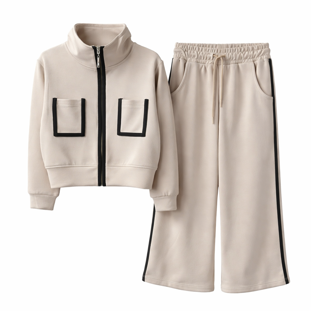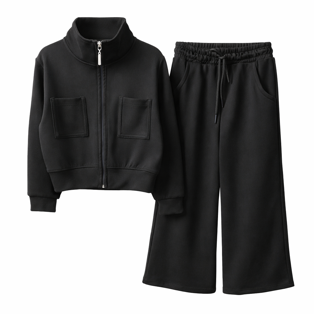 Duksi me zinxhir ka dizajn praktik me jakë të lehtë dhe xhepa funksionalë përpara, ndërsa pantallonat janë të pajisura me bel elastik dhe lidhëse, duke siguruar përshtatje të rehatshme dhe liri të plotë lëvizjeje. Materiali është i butë, i ngrohtë dhe i qëndrueshëm, ideal për sezonin e vjeshtës dhe dimrit.