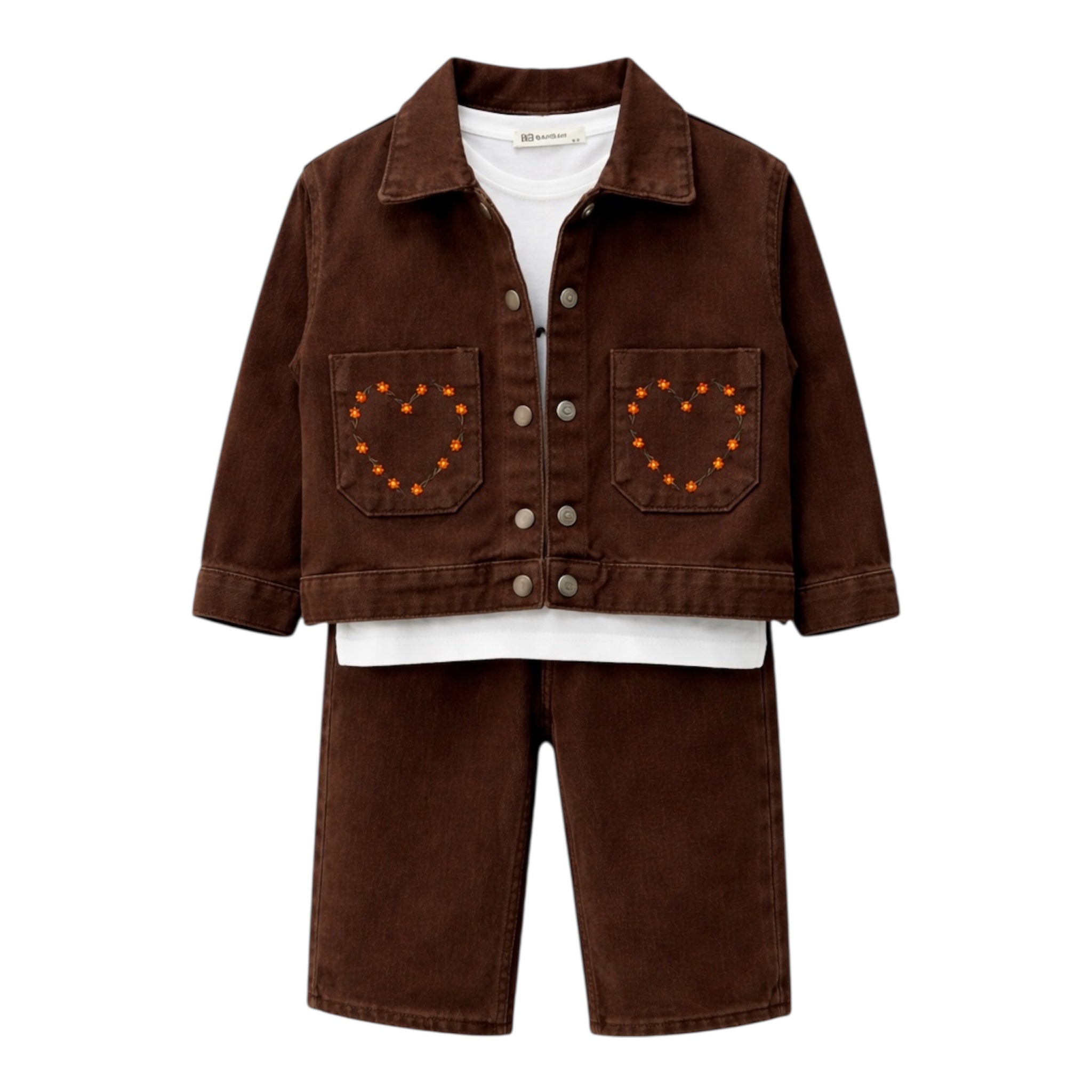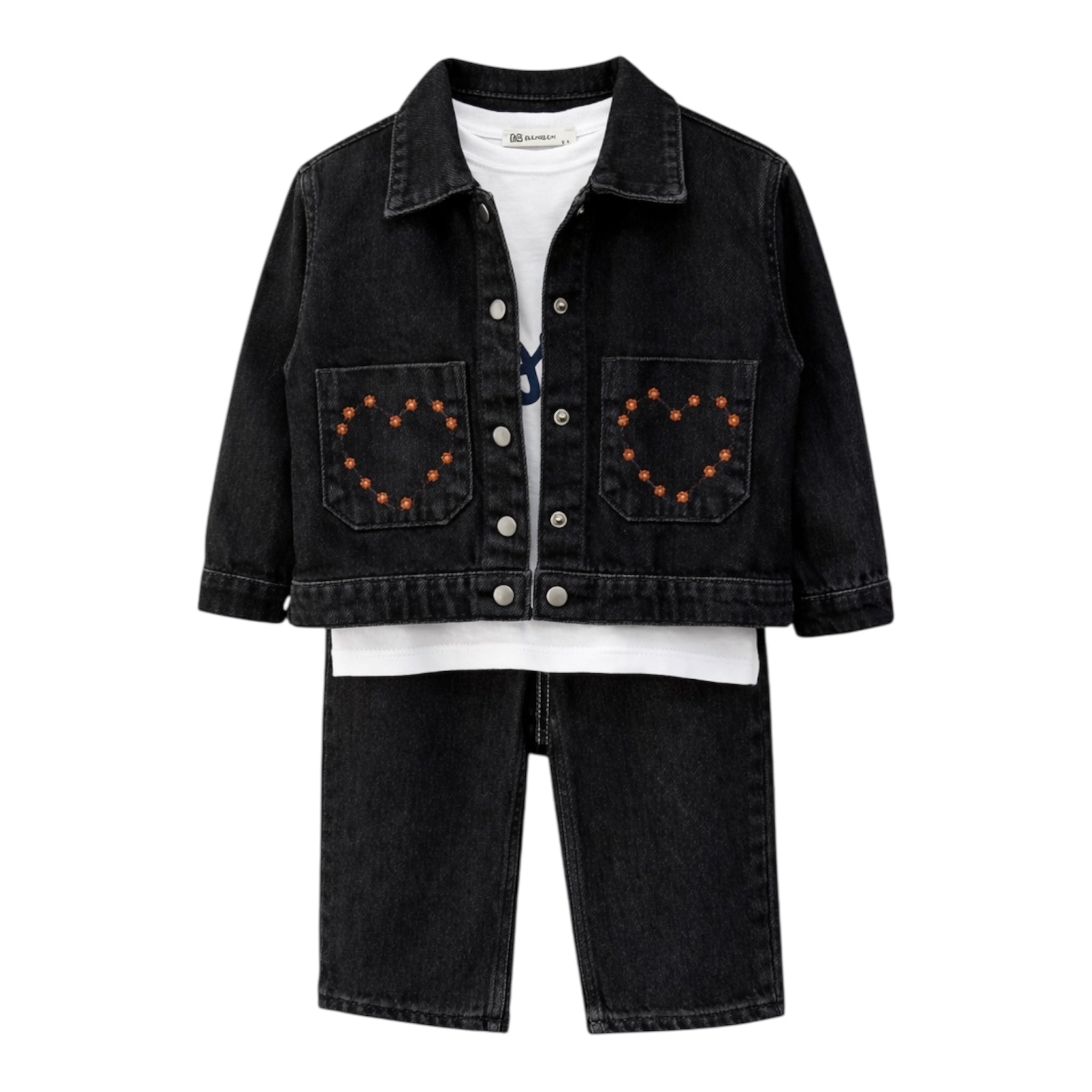 Kompleti është i punuar nga material farmerk, i qëndrueshëm dhe i përshtatshëm për përdorim të përditshëm, duke ruajtur formën dhe pamjen edhe pas larjeve. Xhaketa me pulla i jep kompletit një stil të veçantë dhe elegant, ndërsa bluza e hollë ofron rehati maksimale. Pantallonat plotësojnë setin me një prerje të rehatshme dhe praktike.