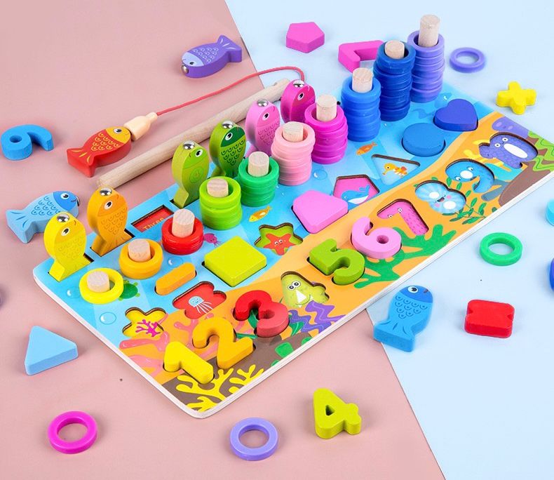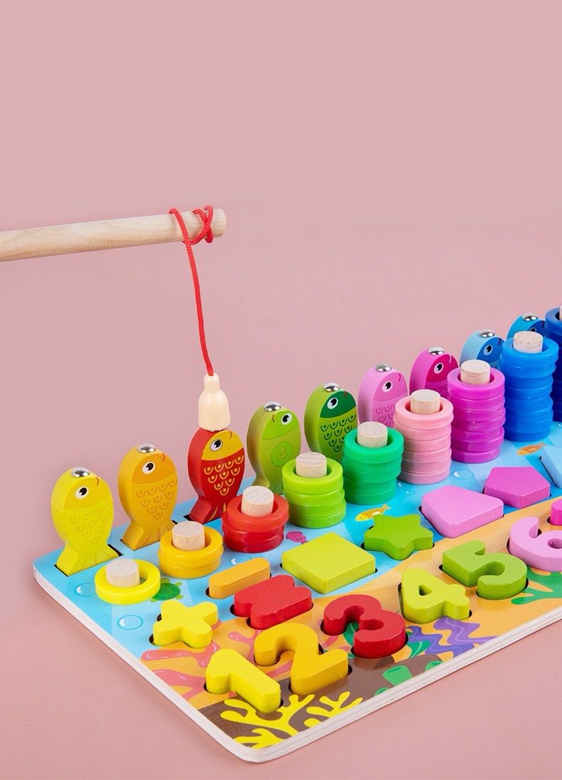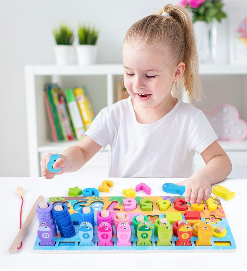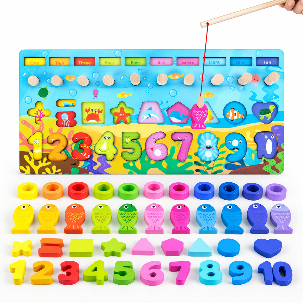 Kjo lodër edukative Montessori prej druri është krijuar për të ndihmuar fëmijët të mësojnë përmes lojës aktive dhe argëtuese. Tabela përfshin numra, forma gjeometrike, unaza për renditje, peshq për lojë peshkimi magnetik dhe aktivitete për përputhje ngjyrash, duke ofruar një përvojë të plotë mësimore në një lodër të vetme.
