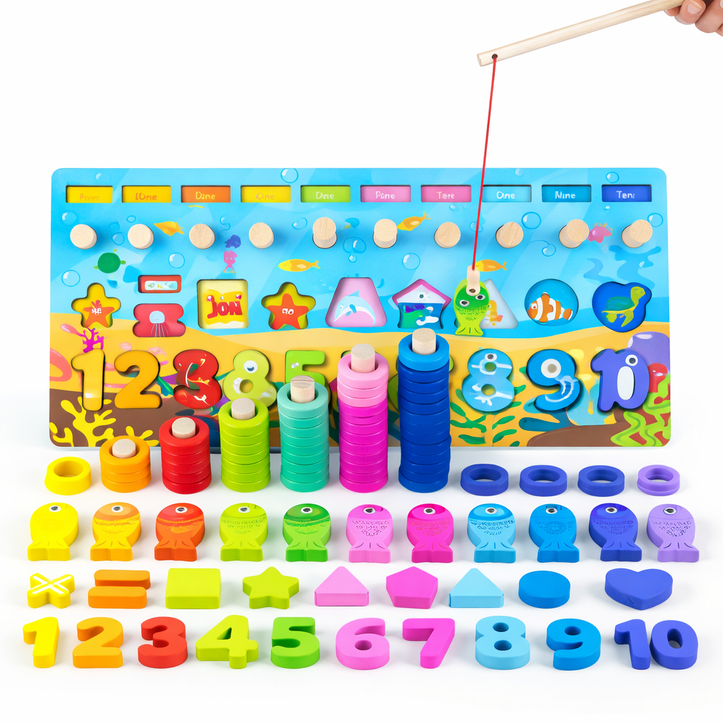 Lodër Edukative Montessori prej Druri – Tabelë Numërimi, Forma & Peshkim për Fëmijë |