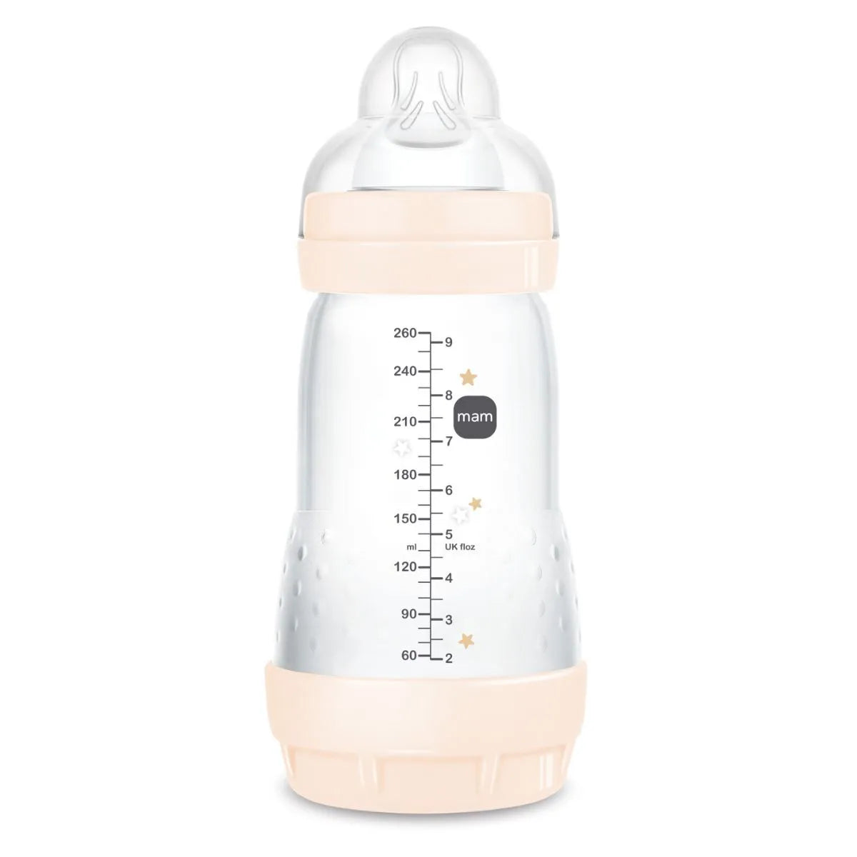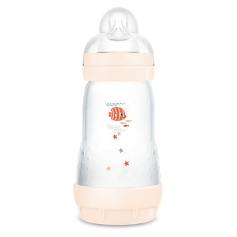 Biberoni MAM Easy Start™ Anti-Colic me kapacitet 260ml është ideal për foshnjat mbi 2 muaj që duan të pinë me ritmin e tyre në mënyrë të qetë dhe të rehatshme. Thithësja SkinSoft™ e butë dhe me formë simetrike ndihmon në kalimin e lehtë nga gjiri tek biberoni. Baza me valvul ajri siguron rrjedhje të butë dhe redukton gëlltitjen e ajrit, duke ulur kolikat dhe sikletin e barkut.
