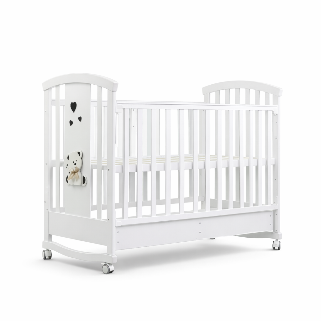 Ky shtrat për foshnje është projektuar për të ofruar siguri, funksionalitet dhe komoditet maksimal gjatë muajve të parë dhe viteve të para të jetës së bebit. Struktura e fortë prej druri dhe dizajni elegant e bëjnë të përshtatshëm për çdo dhomë fëmijësh.