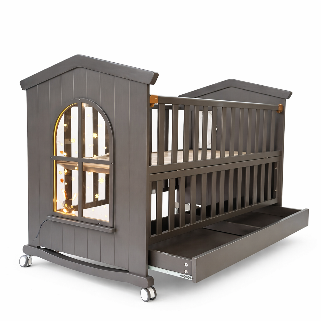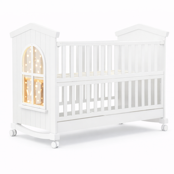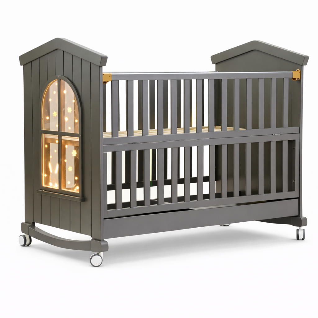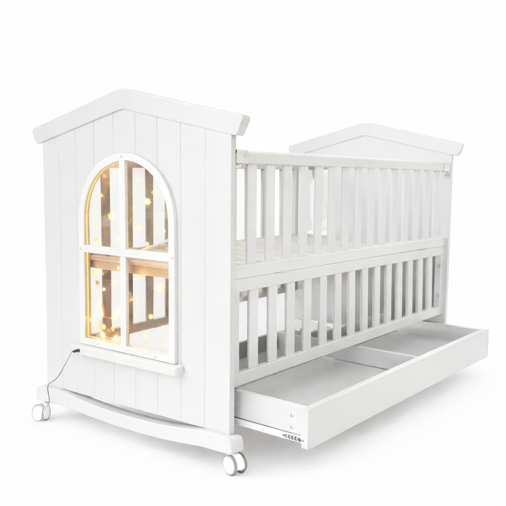 Ky shtrat premium për bebe sjell një dizajn unik me formë shtëpize dhe dritare dekorative me ndriçim LED, duke krijuar një ambient të ngrohtë dhe të qetë për gjumin e foshnjës.