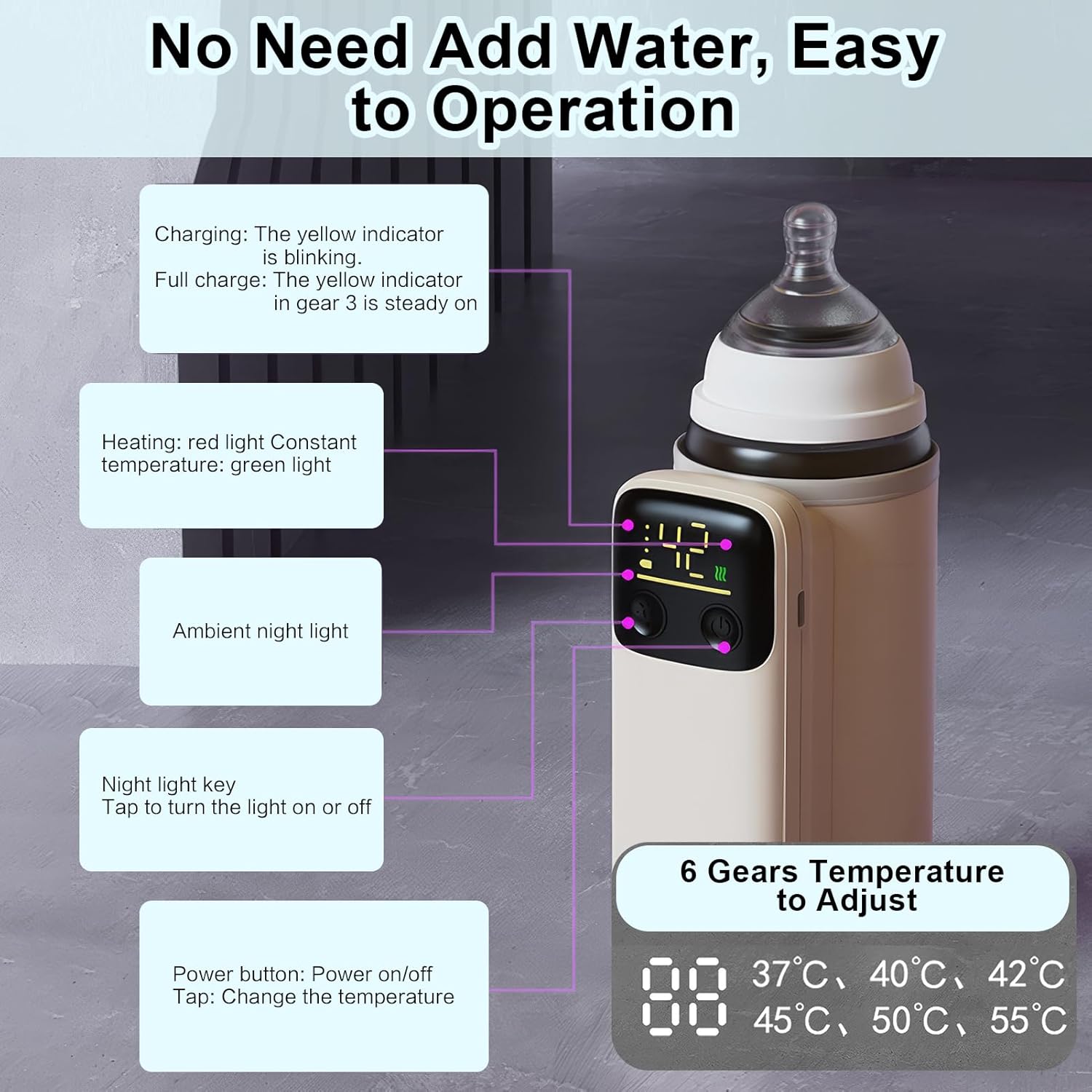 Ngrohësi mund të ngrohi qumështin në 20-25 minuta, dhe ruan temperaturën e ngrohtë për 4-5 orë me një karikim të plotë. Me 6 nivele të temperaturës (37°C, 40°C, 42°C, 45°C, 50°C dhe 55°C), prindërit mund të zgjedhin temperaturën ideale sipas nevojave të fëmijës. Sensoret e integruara të temperaturës sigurojnë që qumështi të qëndrojë në temperaturën e dëshiruar, duke ndaluar ngrohjen automatikisht dhe duke ruajtur proteina dhe ushqyesit e qumështit.